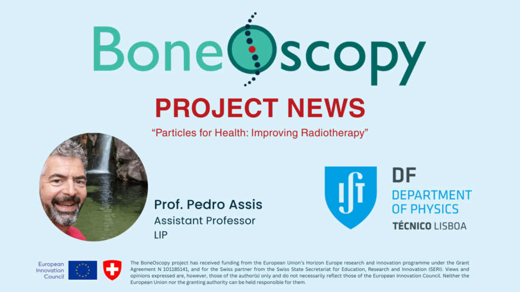On Wednesday, 4 June 2025, project partner Prof. Pedro Assis from the Laboratory of Instrumentation and Experimental Particle Physics (LIP) gave a colloquium presentation on “Particles for Health: Improving Radiotherapy” for the Department of Physics at the Instituto Superior Técnico in Lisbon, Portugal. In his talk, Prof. Assis highlighted the goals of the project, its main challenges, and some of the proposed solutions to raise awareness and inform students about techniques that combine radiotherapy and diagnostics using the same energy beam during bone cancer treatments.